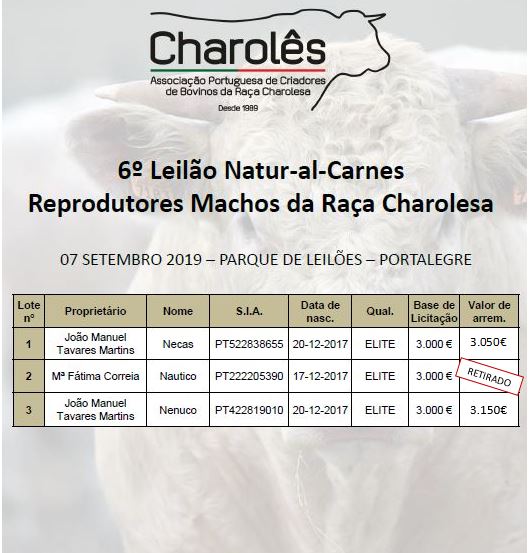 Decorreu no passado dia 7 de Setembro, na FEIRA AGRÍCOLA DE PORTALEGRE, o nosso 6º LEILÃO NATUR-AL-CARNES DE REPRODUTORES MACHOS DA RAÇA CHAROLESA, no parque de leilões de gado de Portalegre. A APCBRC agradece a todos os criadores presentes, e ao público geral, o interesse demonstrado pela nossa raça, durante o certame.