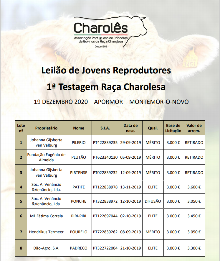 O Leilão de Jovens Reprodutores da 1ª Testagem da Raça Charolesa decorreu durante o dia de hoje, 19 de Dezembro de 2020, contando com a presença dos 8 animais com melhores resultados obtidos durante este teste.