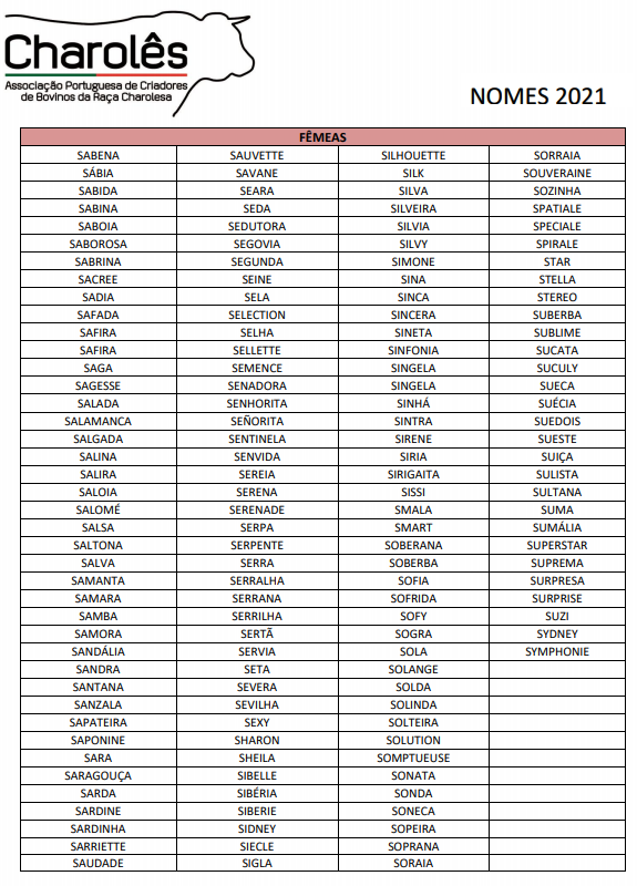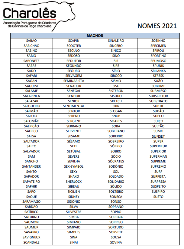 Para o ano de 2021, os nomes dos vitelos Charoleses terão de começar com a letra "S".